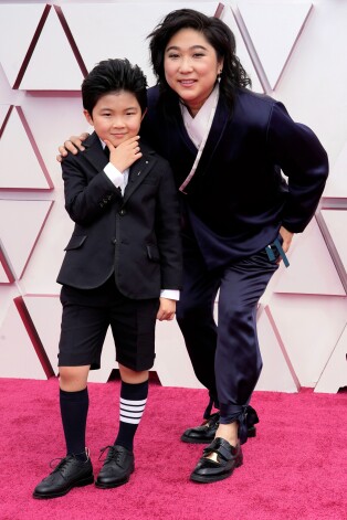 Звезда фильма “Минари”, семилетний Алан Ким уже так поднаторел в киноцеремониях, что на “Оскаре” чувствует себя, как дома. Тем более, что рядом с ними мама Вики. За гардероб юной звезды отвечал самый остроумный американский модный дом Thom Browne.