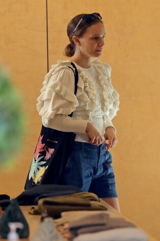 На днях Натали увидели выходящей из художественной галереи — многим известно, что звезда увлекается искусством. Наряд Портман тоже напоминал арт, который оценят только посвещенные. Узкие джинсовые шорты актриса решила дополнить белым трикотажным джемпером с рюшами, похожим на бабушкину кофту. Вместе получился слегка странный, но цепляющий глаз микс!
