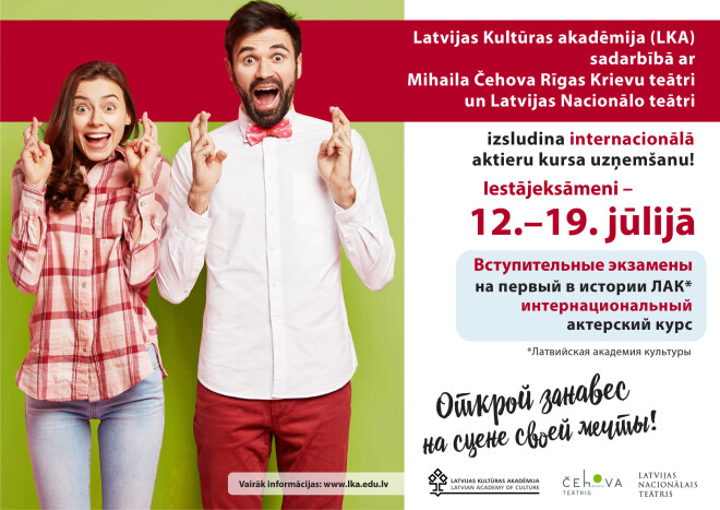 Латвийская академия культуры (ЛАК) в сотрудничестве с Рижским русским театром имени Михаила Чехова и Латвийским Национальным театром объявляет о наборе первого в истории ЛАК интернационального актерского курса. Вступительные экзамены пройдут с 12 по 19 июля.