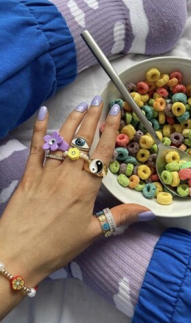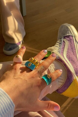 В авангарде этого тренда, как всегда, звезды. Пластмассовые кольца полюбились Белле Хадид, Рианне и Дуа Липе. В Инстаграме можно найти их любимые марки — La Manso и Hotlips by Solange Jewellery (у последней особо хороши пластиковые колечки в форме губ во всевозможных цветах — от нежно-розового до неонового зеленого).