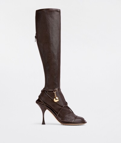 И еще одна новинка, которую трудно назвать “уродливой”, но которая, тем не менее, выглядит весьма причудливо, — сапоги, имитирующие босоножки, надетые на кожаные чулки.