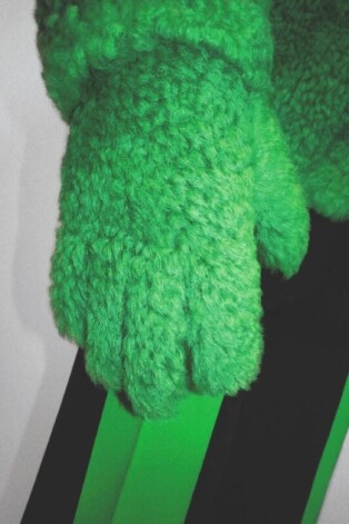 Пушистые варежки оверсайз опять-таки модного зеленого цвета…