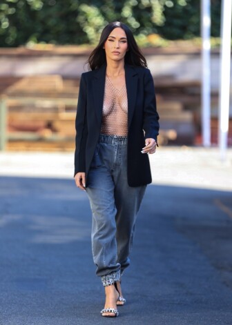 Недавно Меган Фокс была сфотографирована в объемных “джинсах бойфренда” и строгом черном пиджаке, под которым, казалось, нет ничего, кроме голого тела. На самом деле под пиджаком был топ из прозрачной золотой сетки, который только номинально считается одеждой, а на самом деле не скрывает ровным счетом ничего.