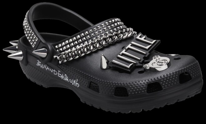 Культовые сабо Classic Clog выполнены в черном и розовом цветах и украшены металлическими шипами, заклепками, цепями, подвесками и надписями в стиле граффити-тегов с названием группы. Также коллекция дополнена джиббитсами в виде сердитого и веселого мишки, вдохновленными татуировкой на спине фронтмена группы Ильи Прусикина.