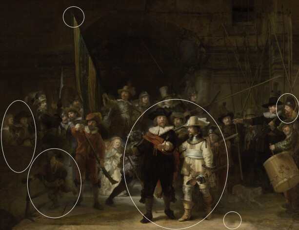 Групповой портрет Рембрандта, также известный как “Выступление стрелковой роты капитана Франса Баннинга Кока и лейтенанта Виллема ван Рейтенбюрга”, был написан в 1642 году и с тех пор считается национальным достоянием Нидерландов. Однако, этот статус не защитил картину от варварского обращения: в начале XVIII века картину обрезали по всему периметру, поскольку она не входила в дверной проем ратуши, где ее хотели повесить. Впоследствии эти фрагменты были утеряны.