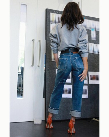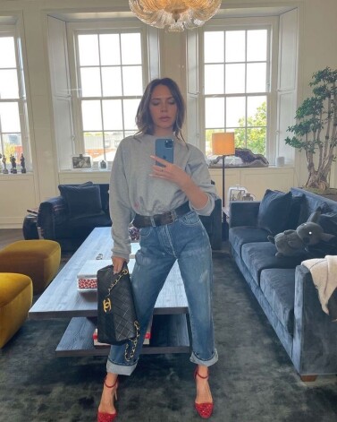 В этот раз Виктория подготовила образ для холодных осенних деньков. Она примерила серый объемный свитшот, а также синие джинсы классического кроя с высокой посадкой, которые подвернула, сделав образ более расслабленным. Брюки она носит с широким ремнем, который в этом сезоне в тренде. Завершили образ открытые туфли на огромных шпильках и стеганая сумочка Chanel на цепочке, сообщает lite.rbc.ua.