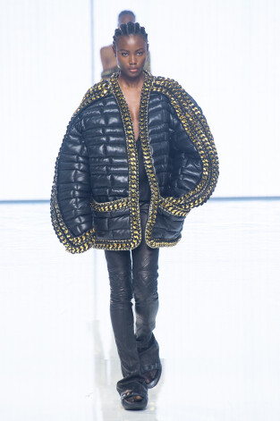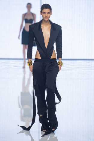 Жесткие структурированные силуэты в духе 1980-х, сложные драпировки и переплетения тканей, много обнаженного тела, золото, цепочки, объемные плечи – здесь были все узнаваемые элементы современной эстетики Balmain.
