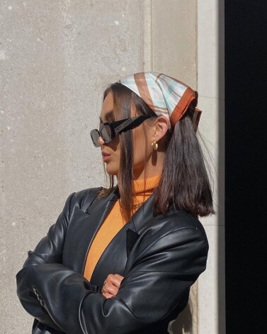 С чем носить: поскольку платок - атрибут исключительно женственный, то наиболее эффектно он смотрится по контрасту с чем-то маскулинным. Это может быть строгое пальто в мужском стиле, куртка-бомбер или огромный пуховик.