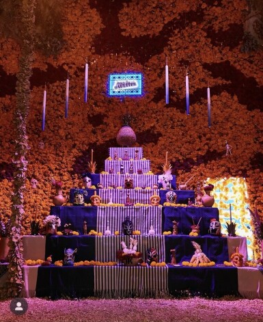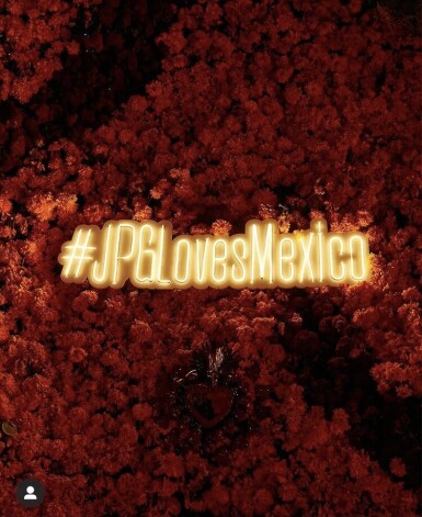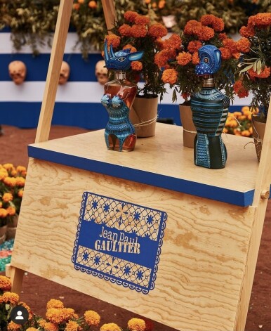 Внутри экспозиция представляет собой гигантский алтарь, на котором причудливо сочетаются свечи, цветочные композиции, традиционные мексиканские статуэтки в виде скелетов и черепов и флаконы духов Jean Paul Gaultier, созданные местными мастерами в различных мексиканских техниках.