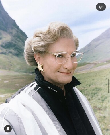 Алексис повторил этот образ, да так, что отличить его от героя Робина Уильямса практически невозможно. Правда, одет он все-таки по-другому - в наряды из последней коллекции Balenciaga.