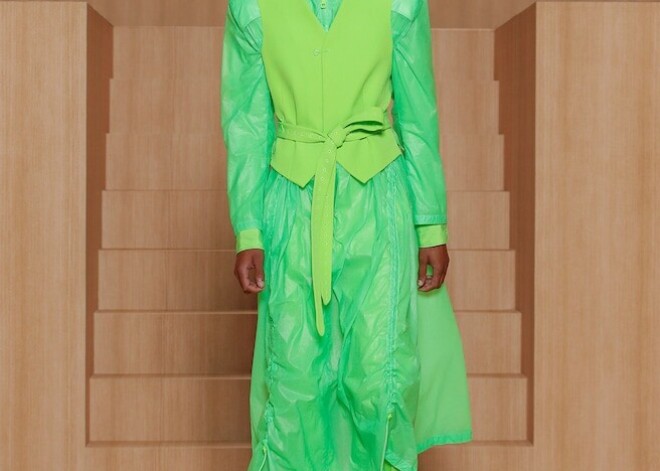 Забавных “детских” аксессуаров, которыми дизайнер развлекался все последние годы (вспомним сумку-самолет или кошелек-морковку), почти не было. Чуть ли не единственный - рюкзак-рыба. Зато было много забавных головных уборов (от фирменных вирджиловских шапок с ушками до вязаных капоров и масок на лицо), аксессуаров преувеличенных форм (перчатки, кроссовки, дутые жилеты), а также настоящая феерия цвета. Очень эффектно смотрелись вещи с градиентом (например, с переходом цвета из зеленого в синий), а также огромные меховые ушанки ярко-розового, салатового и фиолетового цветов.