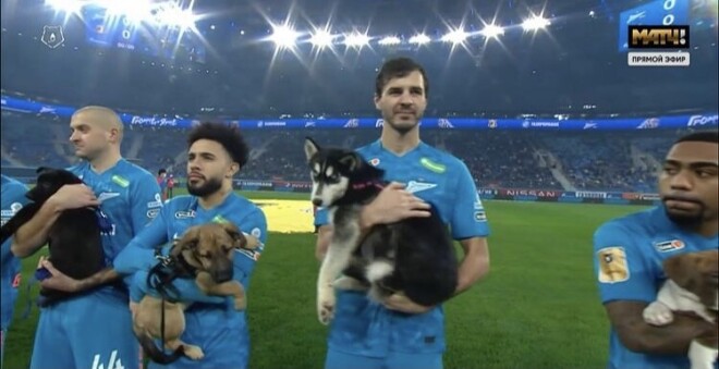 Перед домашним матчем 17-го тура Российской премьер-лиги с командой “Ростов” футболисты клуба “Зенит” вышли на поле с собаками на руках. Так они простояли все командное приветствие, а затем унесли собак обратно. Объявление состава команды сопровождалось роликами о том, как живут собаки в приютах и как можно им помочь.