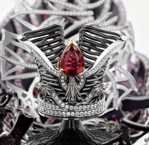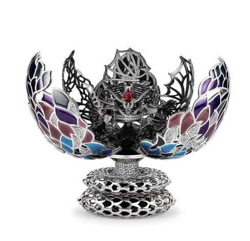 “Скорлупа” яйца сделана из белого золота, “чешуйки” — из эмали с бриллиантовыми паве, бриллианты украшают и основу в виде свернутого хвоста. Раскрываясь, словно драгоценный цветок, оболочка открывает корону и охраняющего ее дракона. Изнутри яйцо украшено розовыми сапфирами и рубинами, а в центре миниатюрной короны, форма которой была позаимствована у одного из пасхальных яиц самого Карла Фаберже, сияет 4-каратный рубин грушевидной формы, добытый в Мозамбике, – этот элемент съемный, его можно носить как кулон.