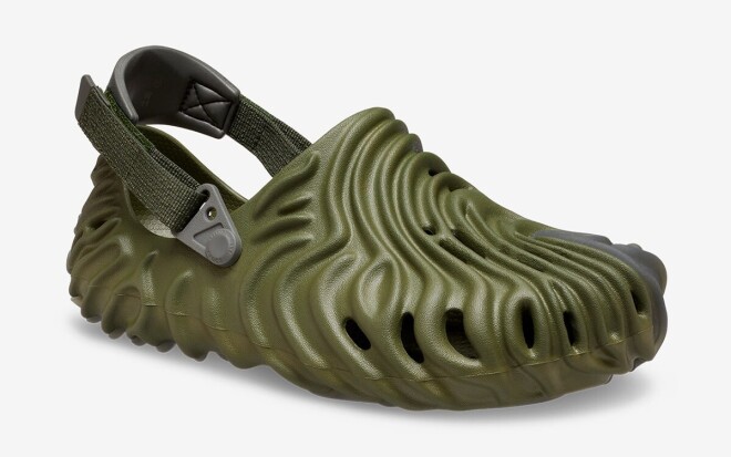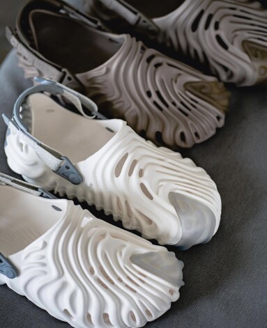 Еще одни прекрасные уродцы — рельефные резиновые клоги, результат коллаборации Crocs с маркой Salehe Bembury. Изготовленные из полиуретановой пены, они имеют ребристую текстуру, вдохновленную рисунком отпечатков пальцев. В передней части обуви сделаны вырезы овальной формы — для воздухопроницаемости.
