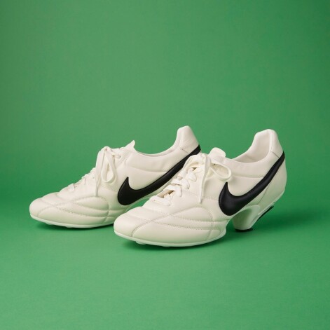 Сникерсы на каблуке появились еще в нулевых, но тогда они продержались в моде совсем недолго. Недавно об этом странном симбиозе кроссовок с женскими туфлями вспомнили в компании COMME des GARÇONS. Результатом ее коллаборации со спортивным гигантом Nike стало переосмысление классических футбольных найковских бутсов 1992 года, которые, кстати, в ассортименте бренда остаются до сих пор.