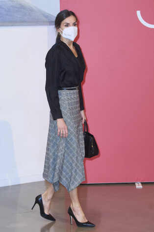 Фасон ассиметричной юбки несколько устарел, но королева мастерски обыграла его, сочетав с черными лодочками и черной сумочкой.