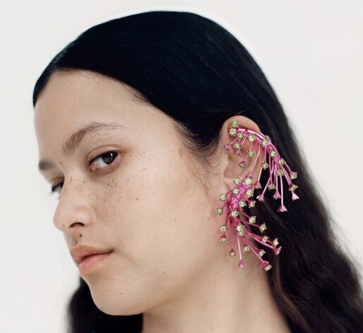 Дизайнер делает украшения из кварца и темного вулканического стекла, часто работает с эмалью, любит кристаллы и особенно гордится “перевернутыми” серьгами-кольцами Upside Down.