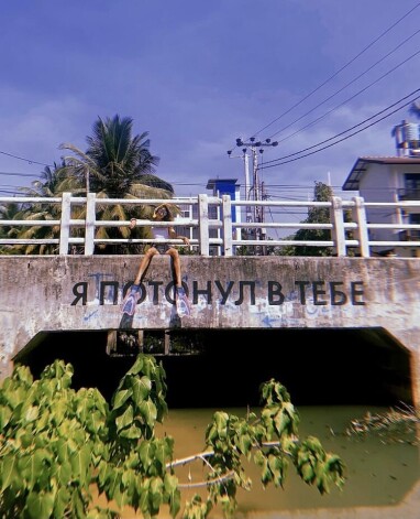 Позже Сергей опубликовал фотографию другого своего стрит-арт проекта, осуществленного на Шри-Ланке, — надписи на мосту через речку “Я потонул в тебе”.