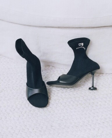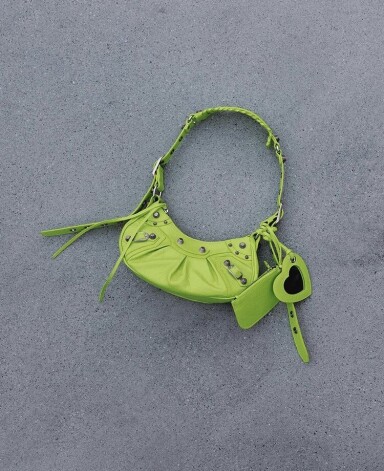 Здесь же можно увидеть бестселлер марки, сумку La Cagole, в черном и неоново-зеленом цветах, а также остроносые ботильоны с имитацией носка.