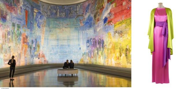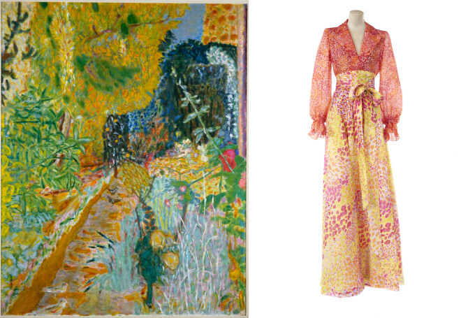 В Музее современного искусства сделали акцент на цветах и тканях. Наряды Сен-Лорана выставлены на фоне работ Пьера Бонара “Сад” (1937) и “Обед” (1932) и настенной росписи Рауля Дюфи “Волшебное электричество” (1937) - влияние живописи тут совершенно очевидно.
