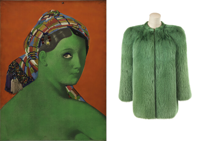 В Центре Помпиду выставке отвели сразу два этажа. В зале Делоне выставлено платье из коллекции “Посвящение Пикассо и Дягилеву” (1979), в котором чувствуется влияние творчества французской художницы Сони Делоне. А зелёная меховая шуба из коллекции Сен-Лорана Scandale 1971 года находится рядом с картиной поп-арт художника Марсьяльи Райса “Сделано в Японии. Большая одалиска”.