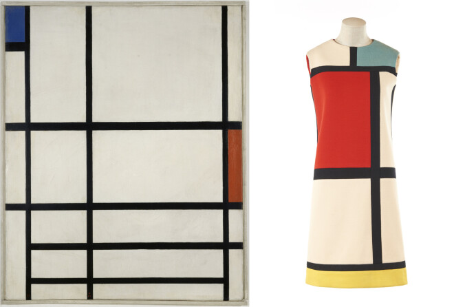 Здесь же находится, пожалуй, самая известная работа Сен-Лорана, связанная с искусством модерна, - коктейльное платье “Мондриан” из одноименной коллекции 1965 года. Разумеется, оно выставлено на фоне оригинала - “Композиции в голубом, синем и белом цвете II” (1937) Пита Мондриана. Кстати, Сен-Лоран сделал очень много для того, чтобы голландского художника узнали широкие массы: раньше о Мондриане знали лишь специалисты-искусствоведы.