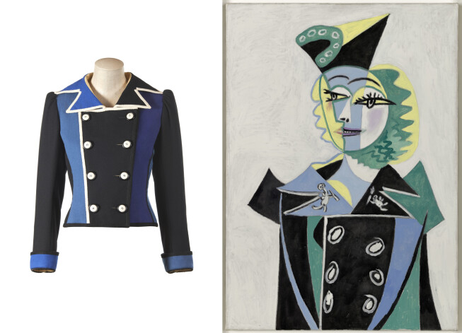 В Музее Пикассо представлены работы, в которых Сен-Лоран цитировал великого испанца. Например, тёмно-синий жакет, как у героини “Портрета Нюш Элюар” (1937).