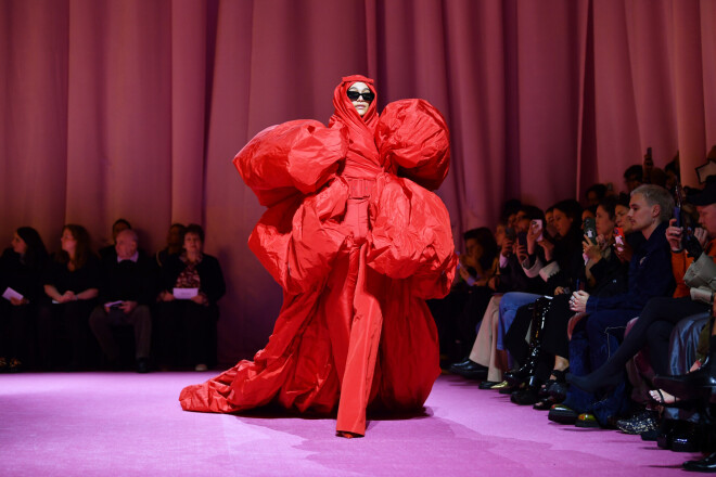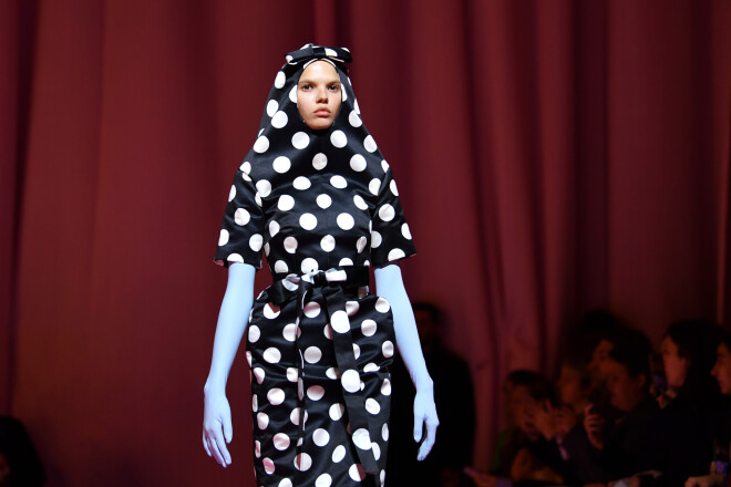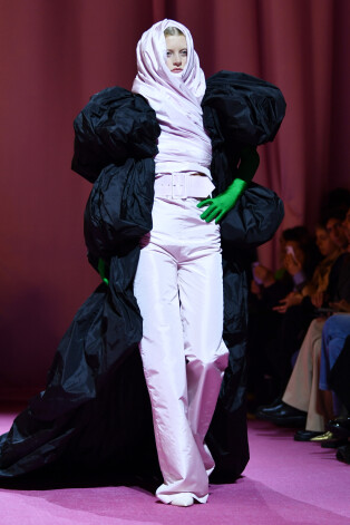 Для перчинки на показе присутствовала и доминатрикс в черном лаковом комбинезоне (в этом образе на подиуме появилась драг-перформер Вайолет Чачки). Настолько безопасно чувствовал себя ее "питомец", можно лишь предполагать.