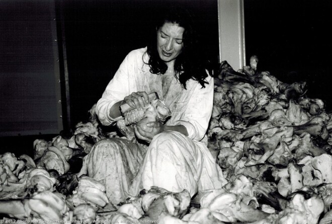 Свой антивоенный перформанс Марина Абрамович показала на Венецианской биеннале, получив за него “Золотого льва”. И хотя, по ее словам, она посвятила его “каждой войне”, ясно, что наиболее близкой ей темой была Гражданская война в Югославии. Во время перформанса Абрамович счищала мясо и кровь с коровьих костей, напевая при этом народные песни и рассказывая истории. Венецианская жара делала смрад, исходящий от полутора тонн сырого мяса, невыносимым, таким же, как и чувство вины за погибших в войне людей: “Вы не сможете смыть со своих рук кровь, как нельзя смыть позор войны. Но все же очень важно преодолеть это чувство”, — говорила художница. Позже в одном из интервью Абрамович заявила: “Каждый раз, когда меня спрашивают, откуда я родом, я отвечаю (особенно американцам): “Этой страны больше не существует, потому что вы ее разбомбили, уж простите”.