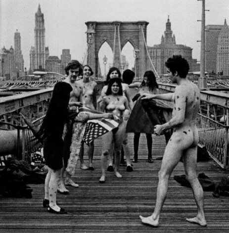 Художница и ее друзья выразили свой протест против войны во Вьетнаме, появившись обнаженными на Бруклинском мосту в Нью-Йорке. Их тела были разрисованы красными точками, которые выглядели как пулевые ранения. Акция закончилась сожжением американского флага. Также Кусама написала письмо президенту США Ричарду Никсону, в котором предложила ему заняться любовью, чтобы он “умерил свой воинственный пыл”.