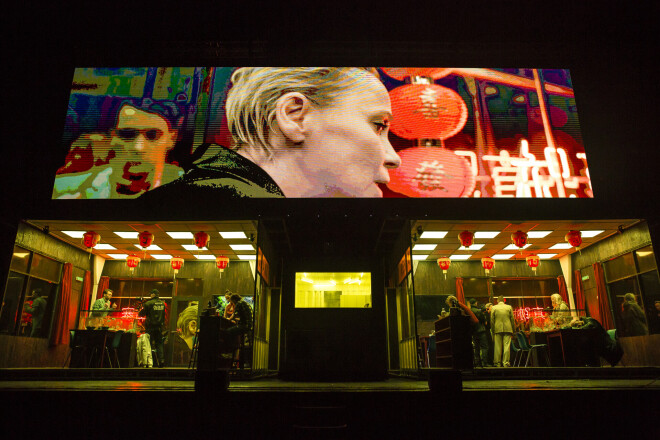 Примерно такое же впечатление производит и ROTKHO, хотя общая форма здесь остается традиционной: действие происходит на сцене, а зрители сидят на своих местах в зале. Решающую роль здесь играют высокие технологии (партнером театра “Дайлес” стала компания LMT). На сцене, помимо декораций-трансформеров, находятся несколько огромных экранов, на которые транслируются видео, снимаемые в режиме реального времени. Таким образом, создается не только эффект присутствия, но и объемная, многослойная живая картинка, которая вместе со специфическим, местами крайне раздражающим звуком (на входе зрителям даже выдавали затычки для ушей) действует просто завораживающе.
