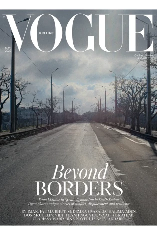 На обложку издания помещен снимок, сделанный 9 марта в окрестностях украинского города Николаев военным фотокорреспондентом Уильямом Кео. Текст на обложке гласит: “Поверх границ. От Украины до Сирии, от Афганистана до Южного Судана, Vogue рассказывает уникальные истории людей, вынужденных бежать от войны и сохранивших стойкость". Тем самым редакция Vogue иллюстрирует главную тему выпуска — проблема беженцев.