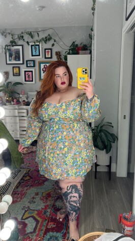 На очередную прогулку Тесс надела легкое голубое платье, с принтом, полностью усыпанным желтыми, оранжевыми и фиолетовыми мелкими цветами. Как обычно длина наряда не достигала даже колен, а зона декольте была открыта. Платье оказалось очень красивым, но с пышной Холлидей оно сыграло злую шутку. Из-за мелкого и яркого принта, наряд визуально увеличил модель, добавив ей ненужный объем.