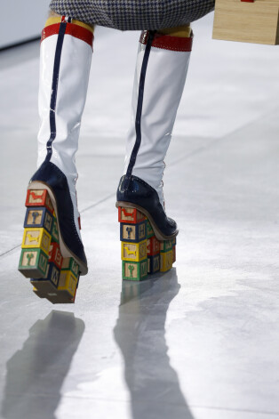 Выделялась обувь на платформе из разноцветных деревянных кубиков.