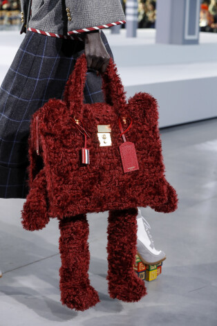 Тема игрушек была обыграна и в одежде, и в прическах, и в аксессуарах. Помимо традиционной для бренда сумочки в виде любимой таксы Тома Брауна, можно было видеть и другие забавные сумки.