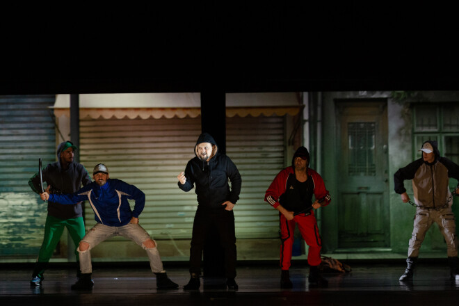 Действие “Дон Жуана” перенесено на родину постановщика, в Южную Америку (из Аргентины не только режиссер, но и сценограф, художники по костюмам, свету и видео). Поэтому в спектакле есть ощутимый латинский привкус – танцоры танго, певец марьячи в сомбреро, бандиты из городских трущоб... Действие перенесено в наши дни: арии поются в мобильный телефон и домофон.