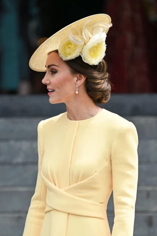 Изумительной красоты бледно-желтое платье Emilia Wickstead и шляпку Philip Treacy в тон, в которые Кейт была одета на национальной службе в соборе Святого Павла, - новинки ее гардероба. Наряды был дополнен серьгами “Бахрейнская жемчужная капля”, которые Кейт “позаимствовала” у Ее Величества: эти серьги были подарены Елизавете на свадьбу с принцем Филиппом в 1947 году.