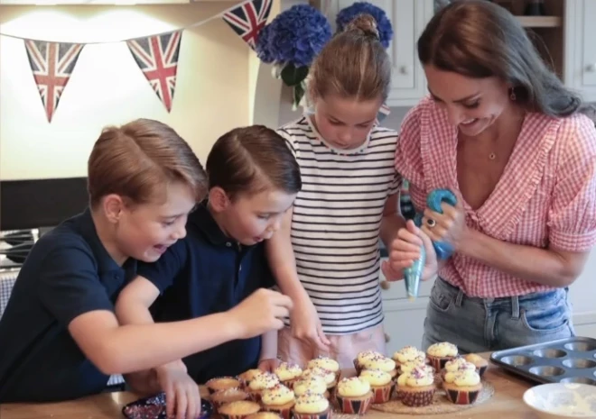 Ну, а кроме того, Кейт поделилась серией фотографий, на которых она вместе с детьми печет праздничные кексы для Ее Величества. Там на герцогине совсем уж простые вещи - голубые джинсы & Other Stories и блузка Brora.