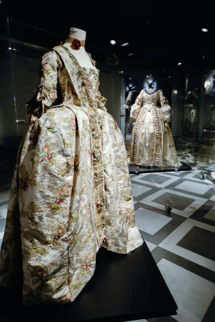 Придворное платье robe à la française второй половины XVIII века, оно же самый старинный экспонат этой выставки. Несмотря на свой почтенный возраст, это платье великолепно сохранилось. Оно сшито из гобеленовой ткани, настолько плотной, что ее с трудом можно проколоть иголкой. Платье дореволюционное (я имею в виду французскую революцию), так что судьба его владелицы впоследствии могла быть незавидной. Возможно, именно поэтому оно и сохранилось — его почти не носили, наверное, висело в шкафу в каком-нибудь замке… Помню, когда я приобрела это платье на аукционе — а за него пришлось побороться, — Александр Васильев поздравил меня с покупкой: вещь, сказал, действительно достойная и ценная.