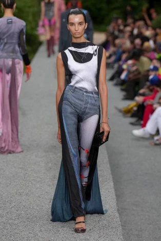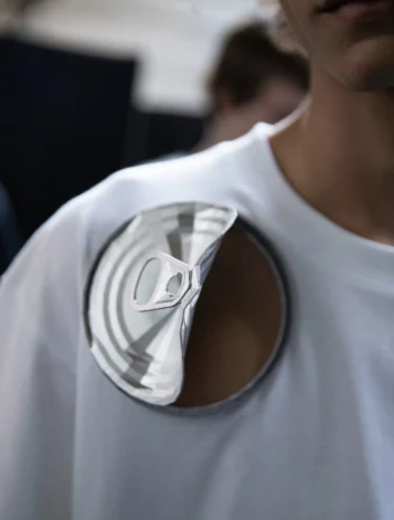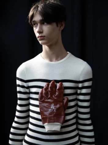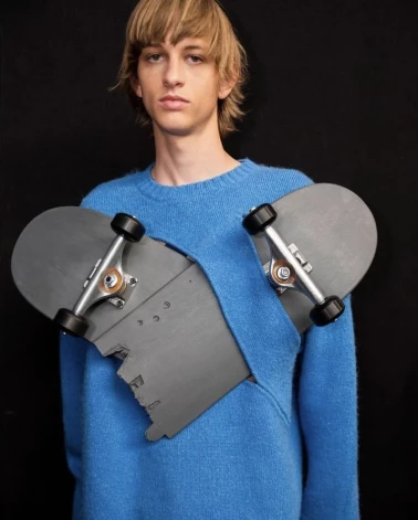 В мужской коллекции весны 2023 можно видеть джемпера с металлическими крышками от консервных банок (в прошлом году это были сливные отверстия) и сломанными скейтбордами, а также топ с “перчаткой мясника”.