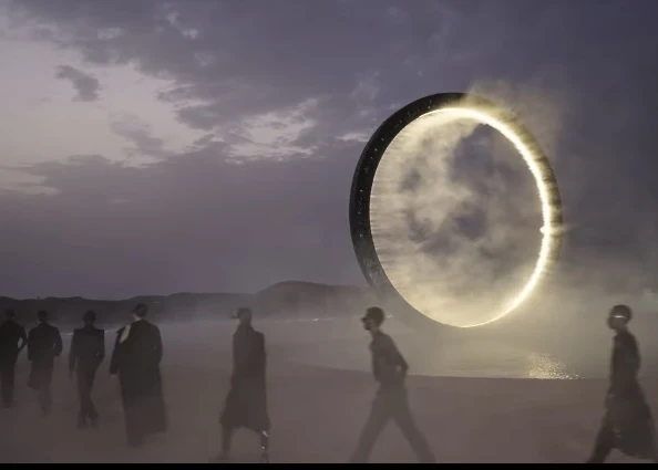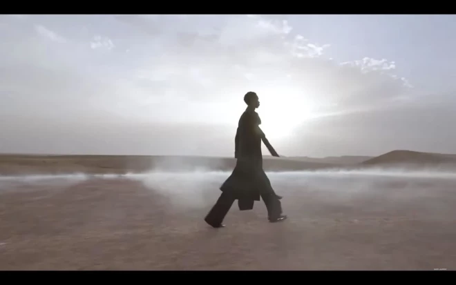 Пока солнце клонилось к линии горизонта, модели шли по пустыне, казавшейся абсолютно безжизненной. Ближе к концу дефиле из земли вдруг выросло огромное подсвеченное колесо (инсталляция художницы Эс Девлин), создававшее эффект футуристического тумана или песчаной бури…