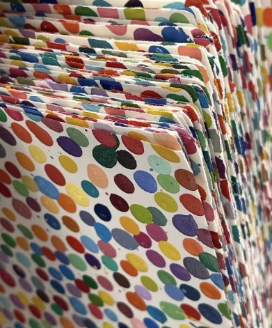 Стоит отметить, что все 10 тысяч картин похожи - они сделаны разноцветными каплями краски, но не являются идентичными. И, кстати, писал их Херст не самолично (он их только подписывал). Создавала их машина. Поэтому везде разная интенсивность красок, количество точек на единицу площади и детали - где-то попадаются фразы с ненормативной лексикой, а где-то забавные рисунки вроде беременных эмодзи.