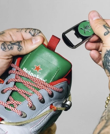 Коллаборация получила название Heinekicks и представлена всего в 36 экземплярах. Авторы новинки заявляют, что это первая пара обуви, которая в прямом смысле слова позволяет ходить по пиву: в подошву кроссовок залит новейший сорт пива Heineken - Silver.