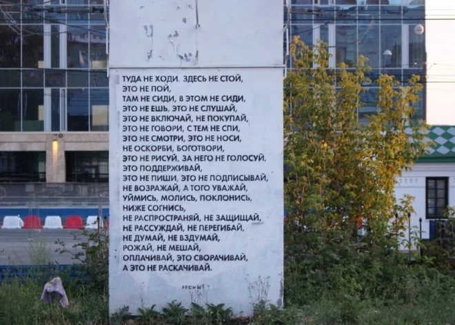В новой работе, созданной на опоре пешеходного моста через железную дорогу около завода Шпагина, художник написал правила современной российской жизни. Вот некоторые из них: “Туда не ходи, здесь не стой, это не пой”, “это не говори, с тем не спи”, “это не смотри, это не носи", “это не рисуй, за него не голосуй”, “это поддерживай, это не пиши, это не подписывай”, “не возражай, а того уважай”, “не рассуждай, не перегибай", “не думай, не вздумай", "рожай, не мешай”, “не скорби, боготвори”.