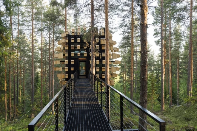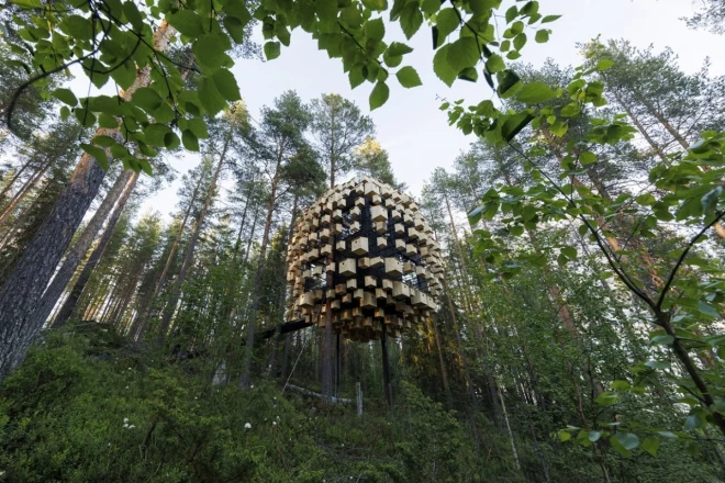 В шведской Лапландии в лесу Харадс появился необычный отель на дереве. Называется он “Биосфера” и состоит из одного-единственного гостиничного номера.