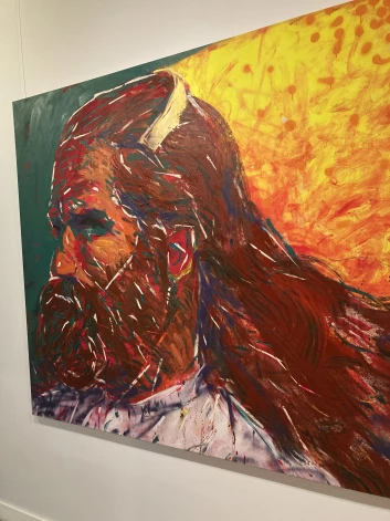 Но что же делает Евгений Мерман? Он берет из атласа отдельных персонажей — охотящегося индейца, мадагаскарских воинов, китайцев за едой, тайскую девочку — и переносит их на гигантские полотна, превращая черно-белые картинки в цветные и наполняя их совершенно новым содержанием.
