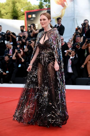 Но, пожалуй, самым эффектным туалетом церемонии можно назвать наряд Джулианны Мур - расшитое бисером и стразами платье с кейпом из черного прозрачного шифона.