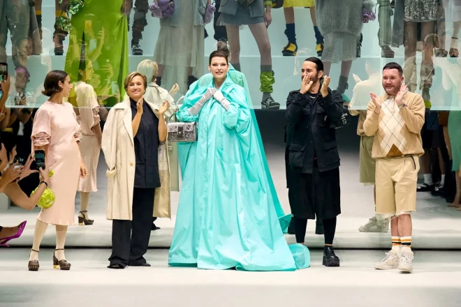 Линда закрыла показ в накидке фирменного цвета Tiffany & Co. и, естественно, с сумкой Fendi.