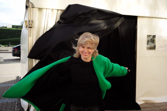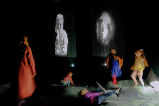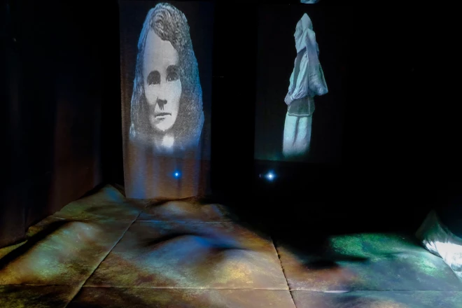 В палатке воссоздана атмосфера настоящего болота. Там темно, единственный источник света – экран, на который проецируются фотографии женщин в белорусской национальной одежде. Слышен стрекот сверчков и какой-то загадочный шепот – не то молитва, не то заговор.