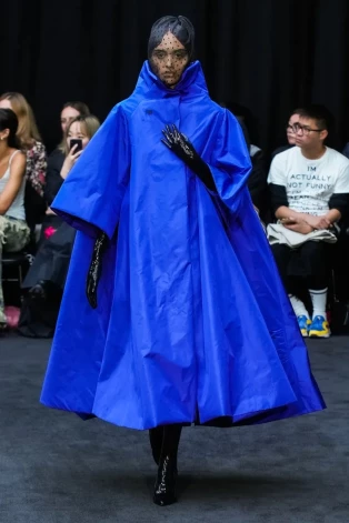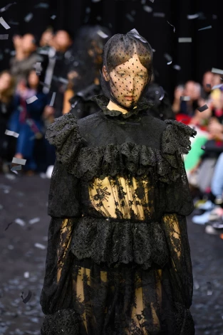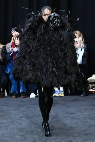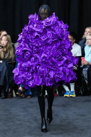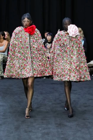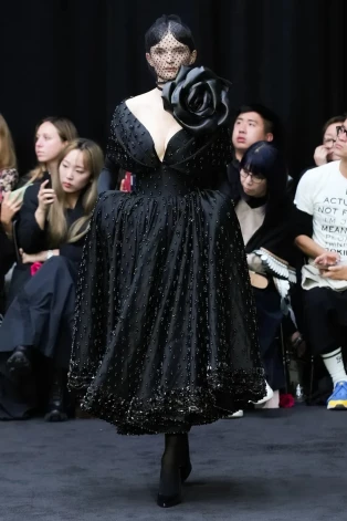 23 черных наряда стали прологом к коллекции Richard Quinn. За ними последовала цветная часть — образы, выполненные в фирменной эстетике дизайнера: скульптурные силуэты, преувеличенные формы, пестрые цветочные принты, гротескные аксессуары.